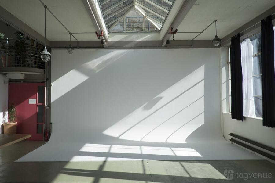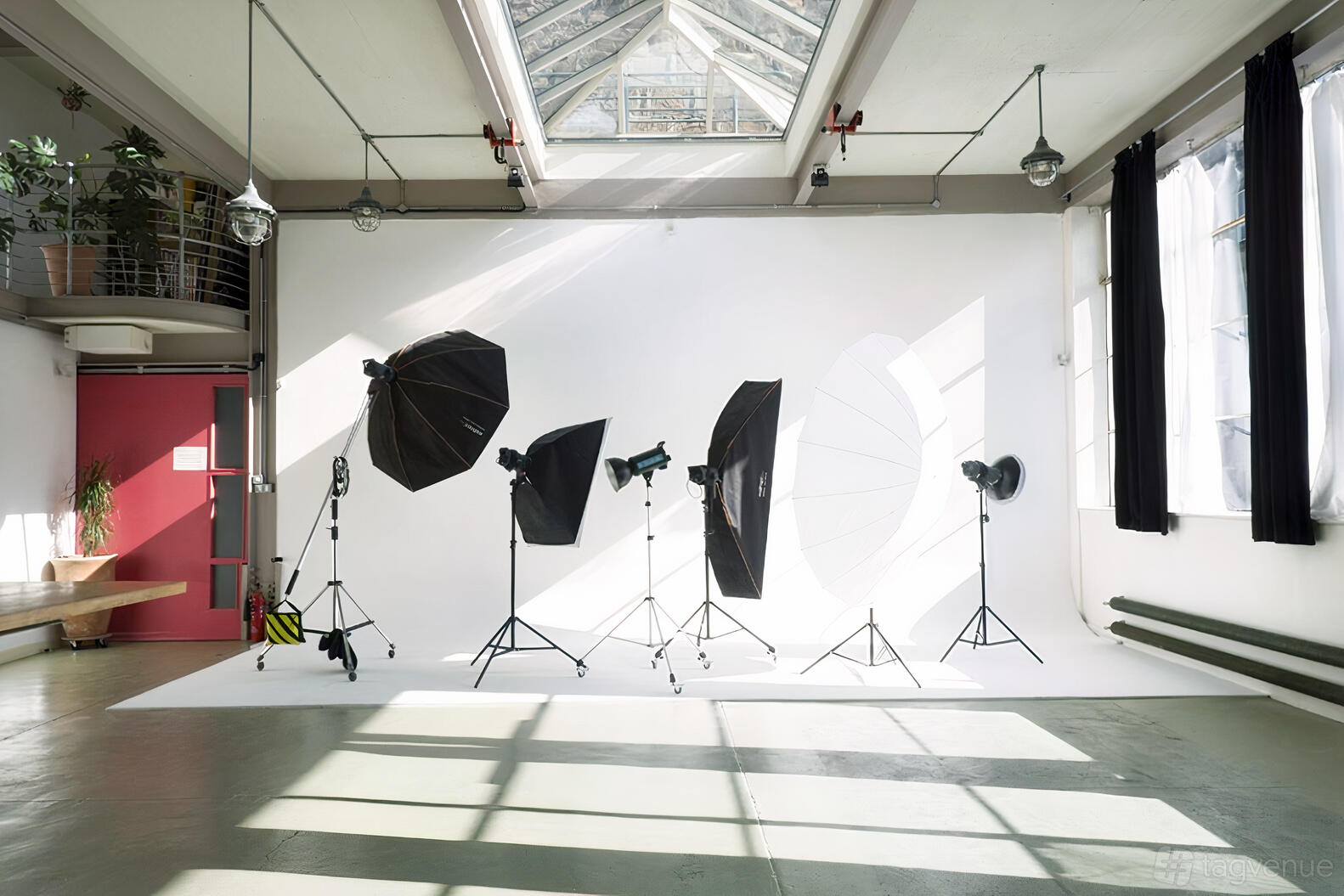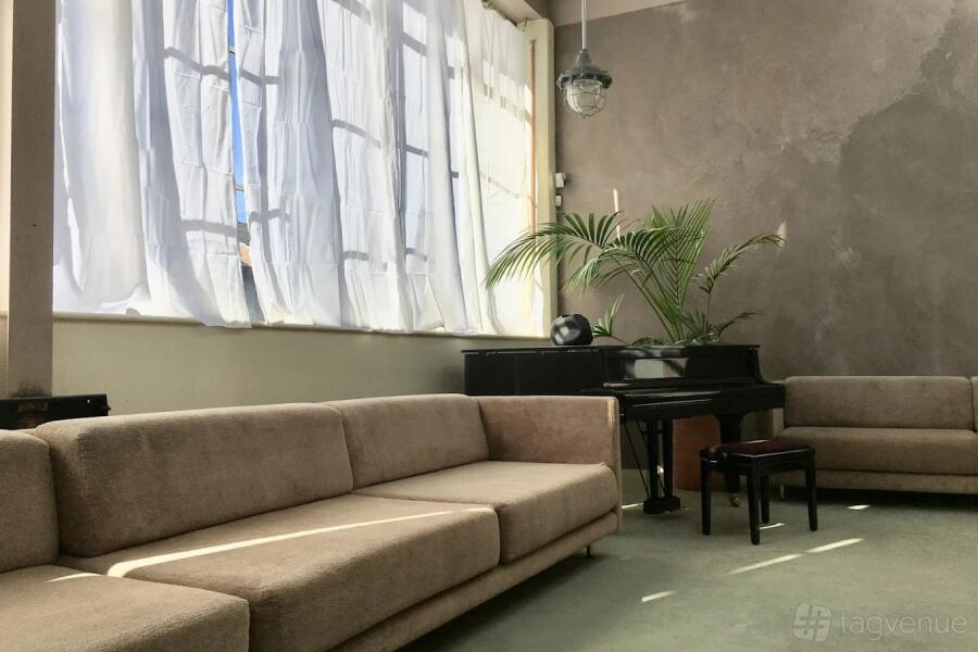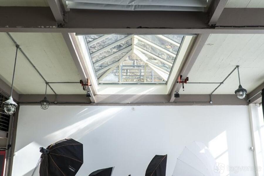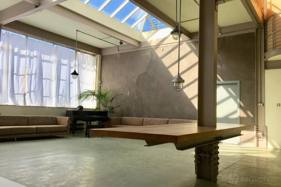 The venue is self-contained, providing a 32' studio, a skylight-lit shooting area, and blackout options. The building retains elements of its industrial past while offering a comfortable space for all-day use.