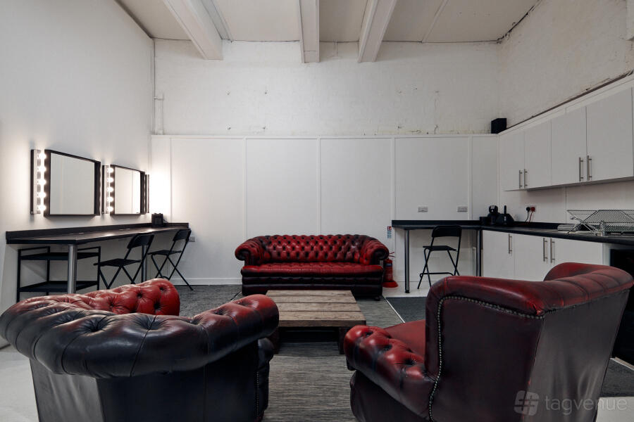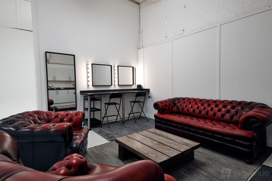 The studio has an array of amenities including a kitchenette with built-in workstations, a client seating area, and fully functional hair and make-up stations.