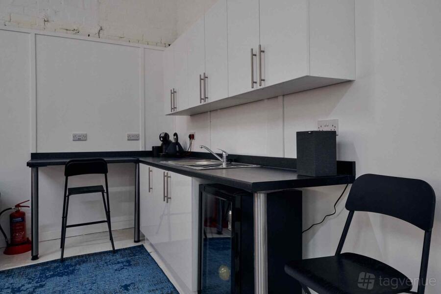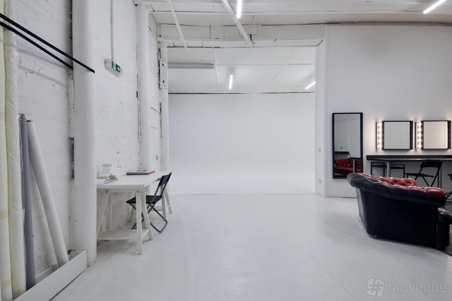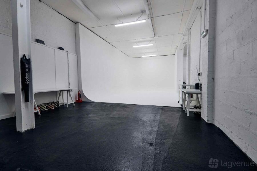 The studio covers 1600sq ft on the ground level and is available for stills and video hire. The space is fully blacked-out to give a variety of controlled lighting options and shooting areas. The infinity cove background is 4m high by 5.5m wide and 8.5m long and a separate 2.75m Colorama bay is also available.