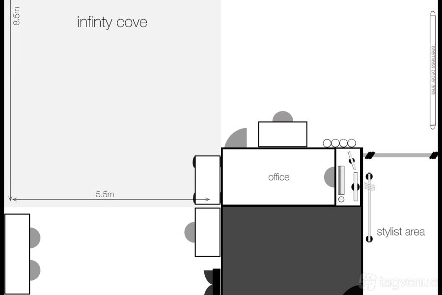 STUDIO SPECIFICATIONS – 1,600 sq ft of studio space. – Infinity cove 8.5m long x 5.5m wide x 4m high. – 3-phase power with 16 Amp and 32 Amp outlets. – Drive-in Access via 2.6m wide x 4m high roller shutter. – Concrete Flooring Throughout. – On-Street Parking. – 2.72m backdrop bay. – Stylist kit including rails, hangers, and clothes steamer...