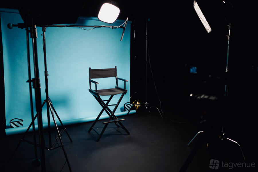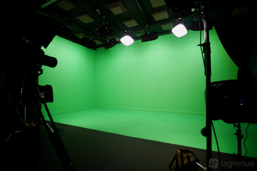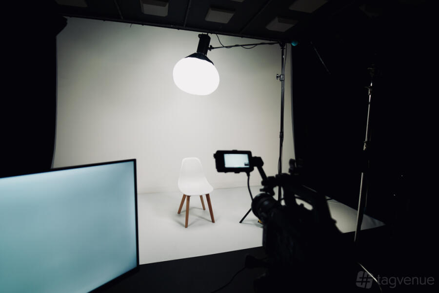 Our studio spans dimensions of 6 meters by 6 meters, standing at a height of 3 meters. The space is versatile and it’s perfect for interviews, small sets, green screens, and lots more. It features sound treatment for optimal audio quality and includes a high-key white wall, a chroma-key green screen wall, and a setup with a black box backdrop.