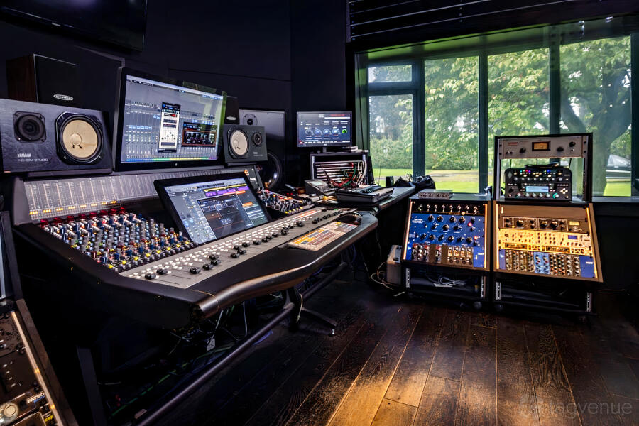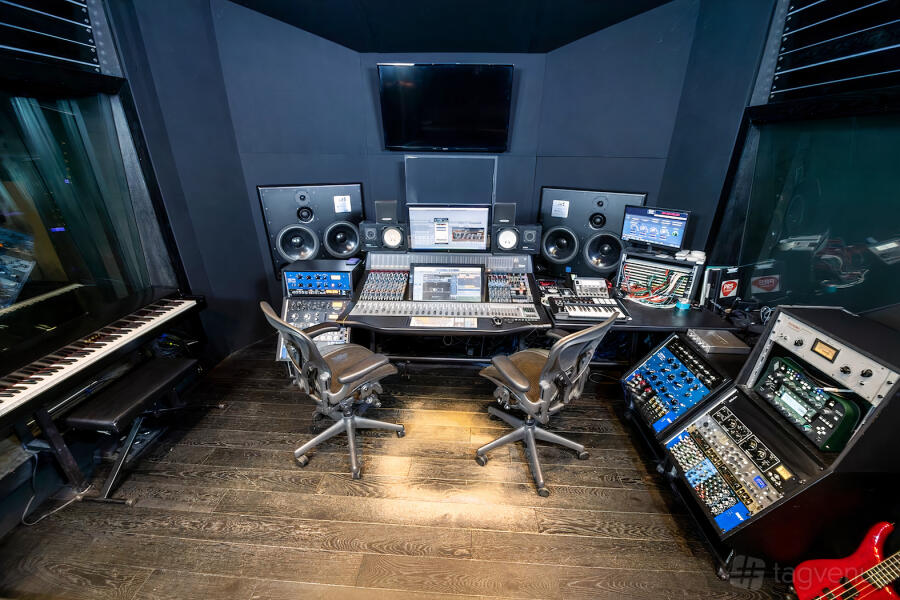 The studio's architecture features spacious, well-lit rooms with modern decor that inspires creativity. Each area within the studio is acoustically treated and designed to cater to a variety of audio needs, from recording and mixing to mastering and post-production.