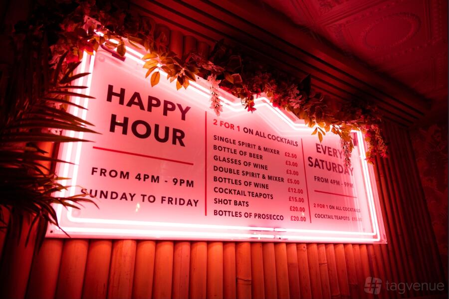 Join us for our famous happy hour from 4pm-9pm Sunday-Friday. So whether you fancy a couple of drinks after work, want to dance the night away or end your night with us, you will not be disappointed. We are open 4pm-2am Mon-Sun. What more could you want?