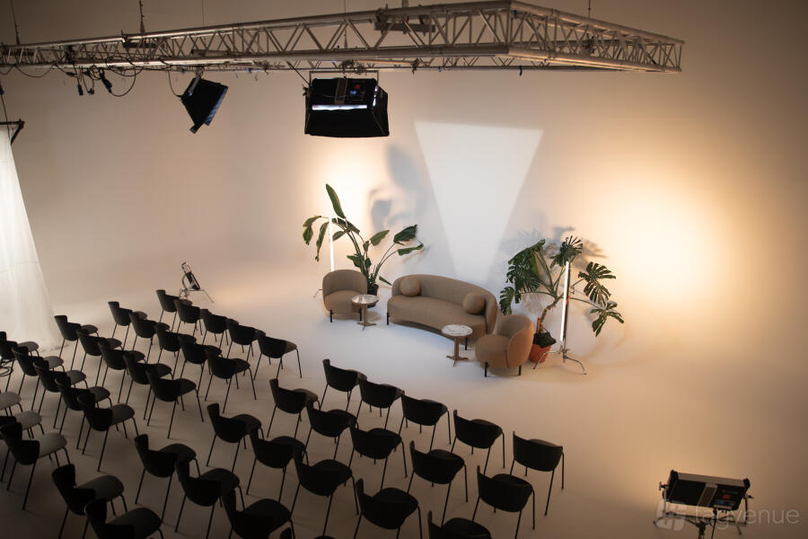 As you enter the facility, you'll find a large reception area with botanical decor, high ceilings, and a cute café around the corner. Near this cafe, you can relax and mingle with guests in the lounge area. The lounge has vintage-chic furniture, wooden accents, and an abstract rug. Once you're ready for your main event, you may choose between various spaces, including the Big Space, the White Stage, and the University Suite. In addition to these unique venues, you and your guests may freshen up in the facility's dressing and hair/make-up room. This space features floor-to-ceiling mirrors, bright lighting, and a classic vanity station.