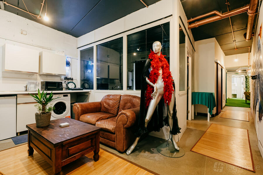 Each piece of furniture has been curated for you to feel good interacting with it, including an impressive throne chair, and an antique chaise lounge. Colours and textures stimulate your senses and provide novelty. From heavy metal stainless steel chains to the soft artificial grass, there are many possible scenes you can imagine and create for your art or play. Indeed, even our coffee table can be used! Before we gave it a new home, the coffee table was used in a play at Southwark Playhouse, which is why it has a reinforced top to take the weight of humans dancing on it.