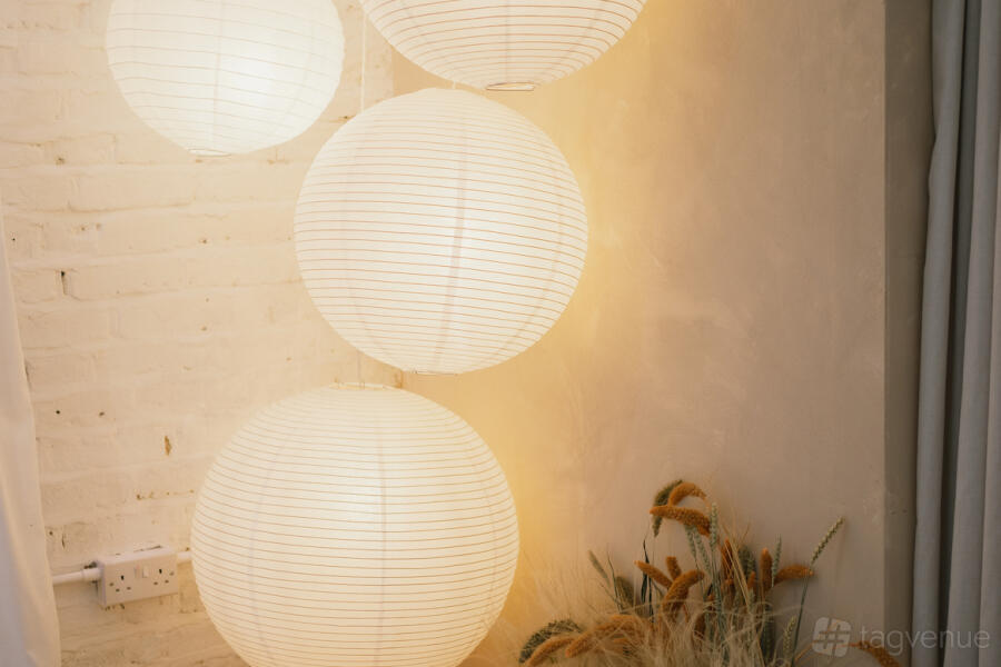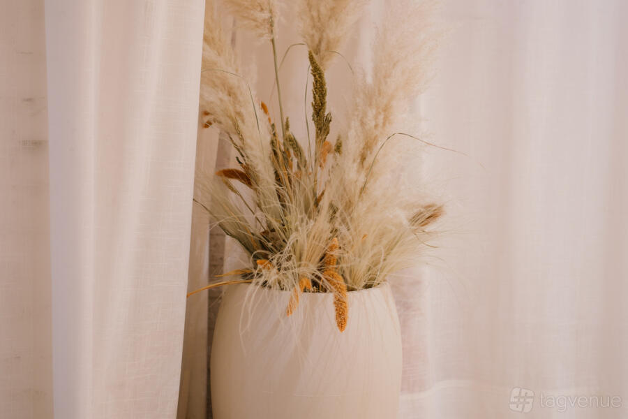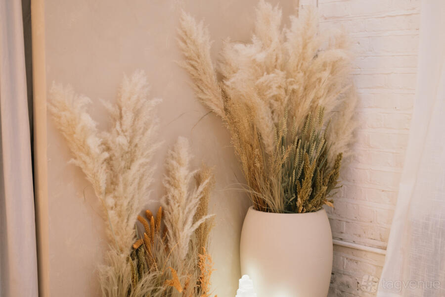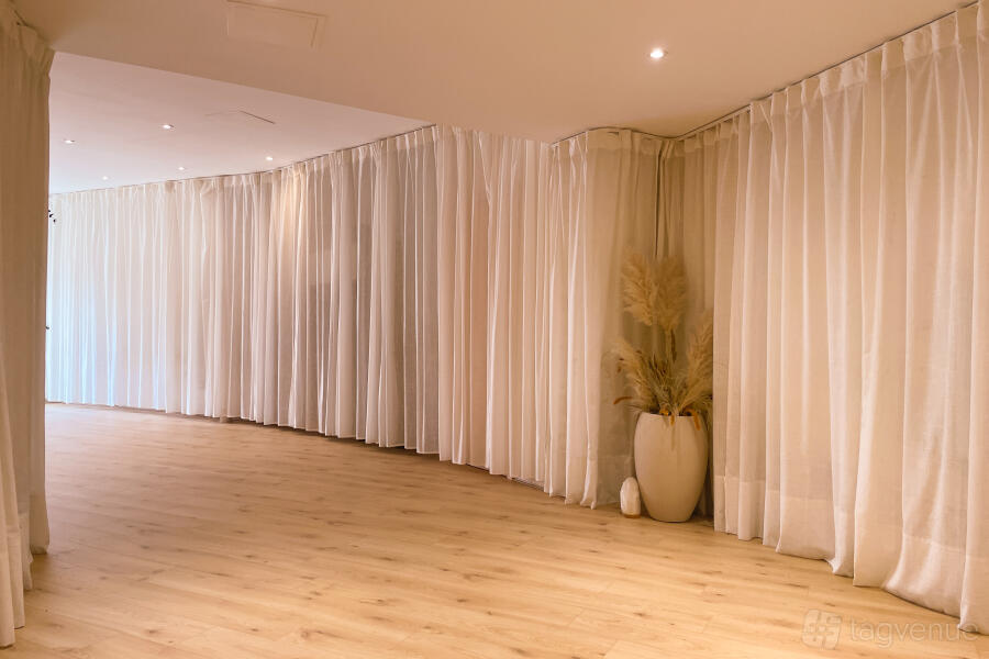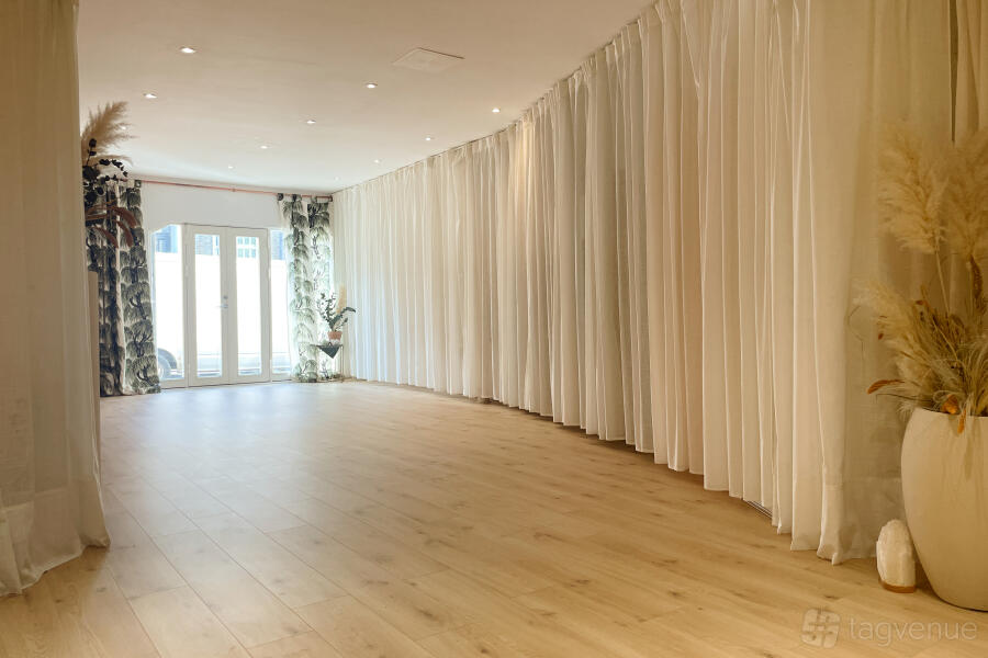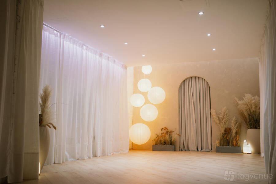 The space is light, bright, and airy with walls draped in white linen curtains. We've decorated the studio with soft lighting, pampas grass, light wood flooring, and crystals to create an ethereal cocoon for any kind of event.