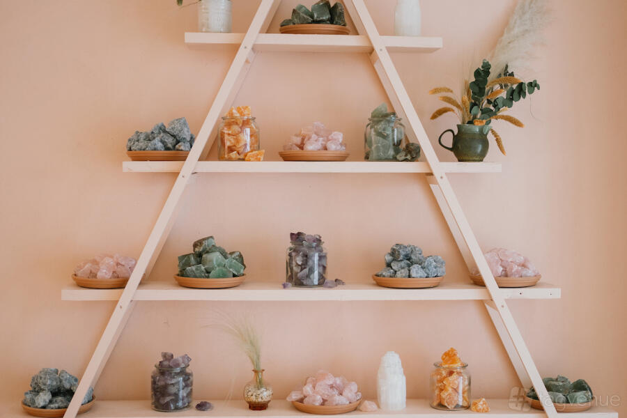 - Instagrammable pink statement wall with wall-mounted triangle shelf with jars of crystals