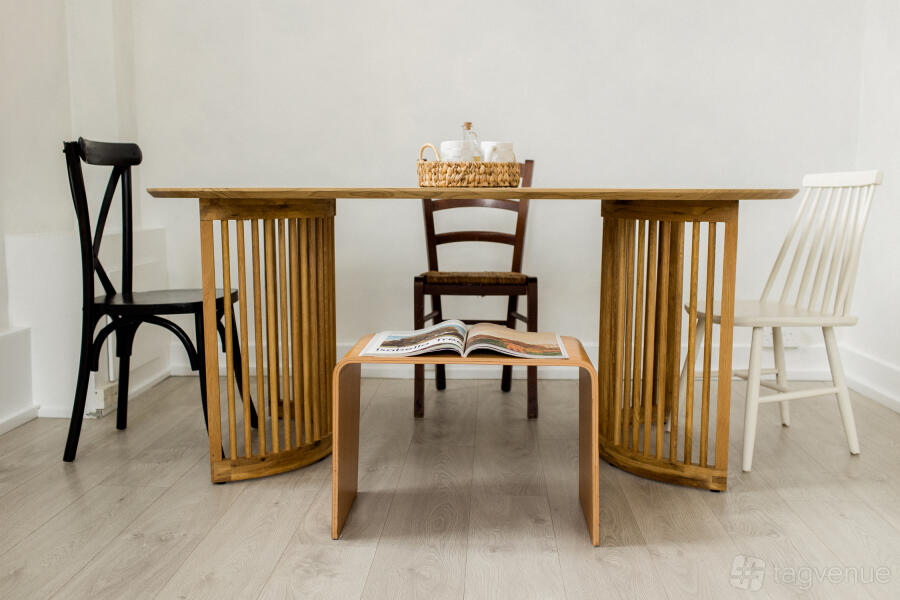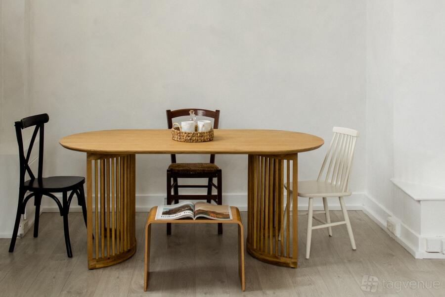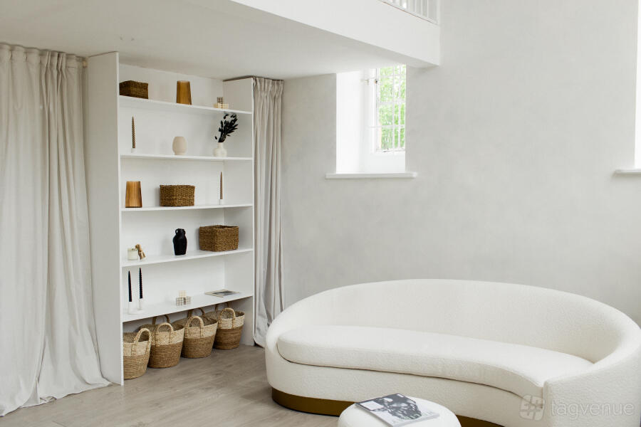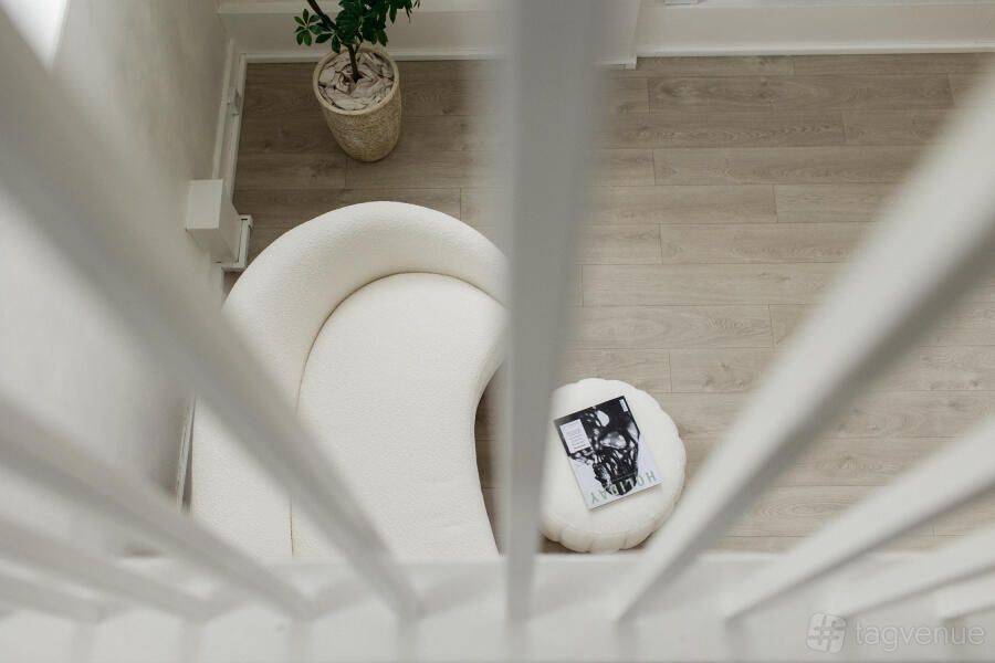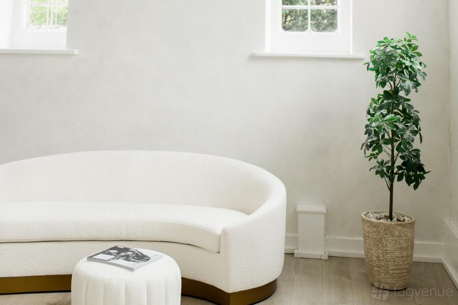 Spanning 750 square feet across two floors, our unique space boasts high ceilings that bathe each corner in radiant natural light. Three distinct areas await your exploration, each adorned with unique furniture and backdrops. From the light limewash high ceiling wall in the main room to the exquisite wooden paneling in another, and the soft, dreamy cream-colored wall in the last, each space offers a picturesque backdrop for your creative endeavors.
