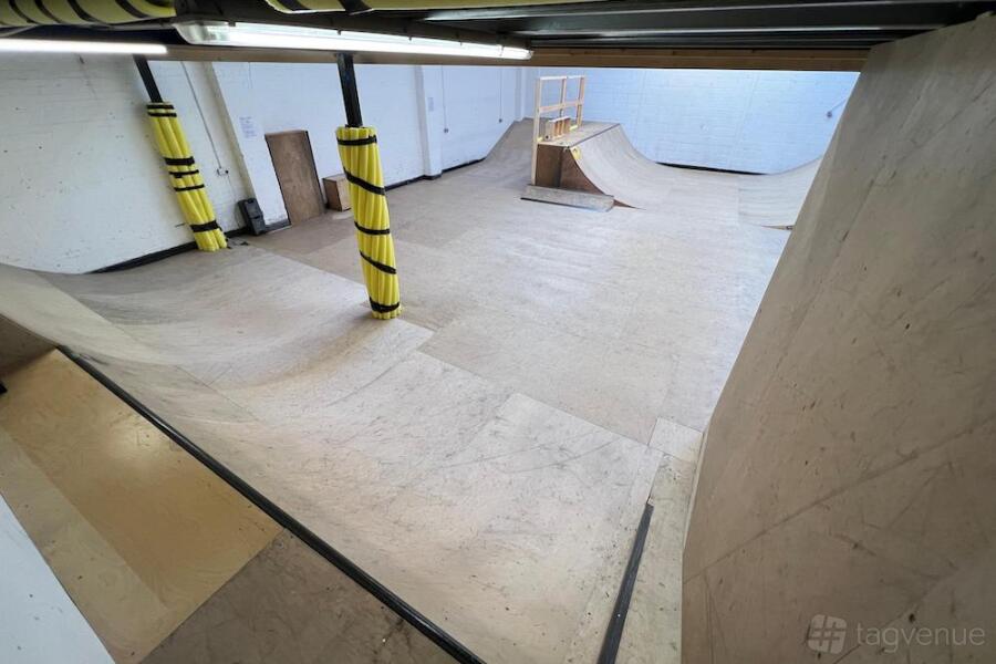 The total space is circa 1925sqft. The ground floor (1625sqft) is a skatepark with a 16ft wide mini ramp, which forms a natural staging area, with wallride under the mezzanine which doubles as an infinity wall for photoshoots. There is projector for showing film and makes a great cinema.