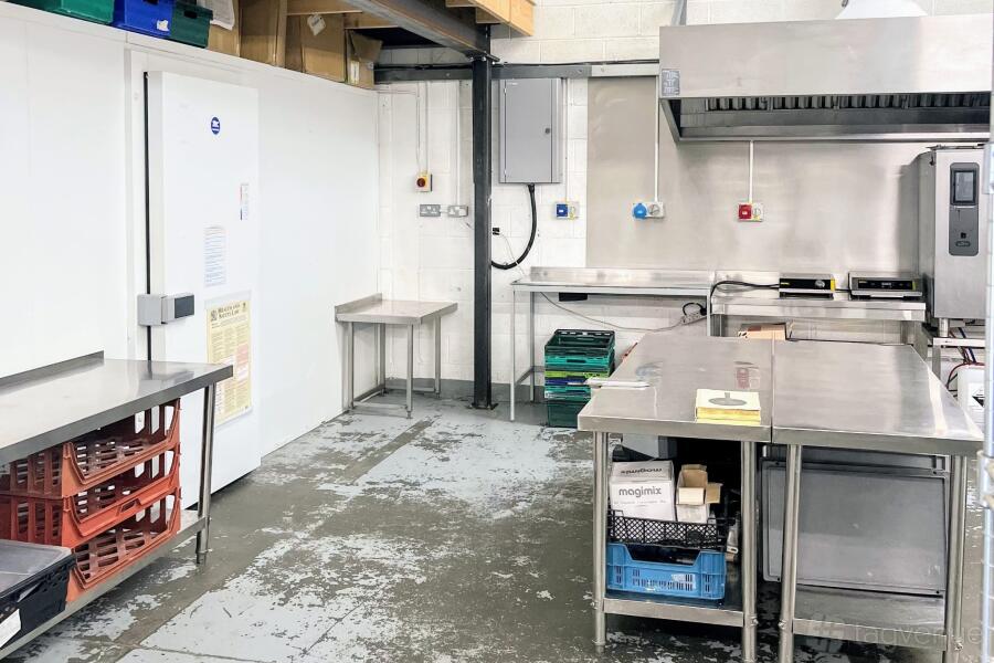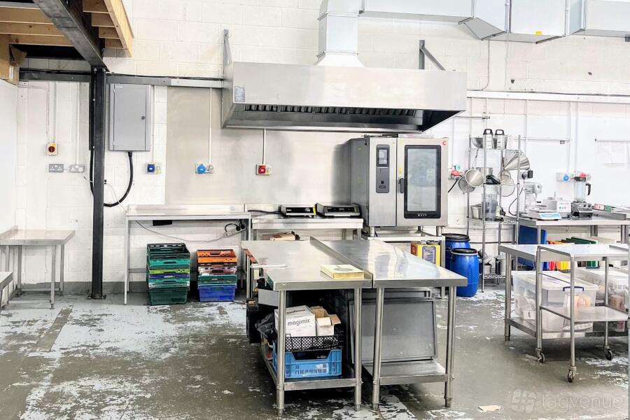 Shared with a catering company, the spacious kitchen takes center stage. The warehouse layout smartly divides it into a dedicated kitchen area and an office/event space. The place is well-lit with high ceilings, creating an inviting atmosphere.