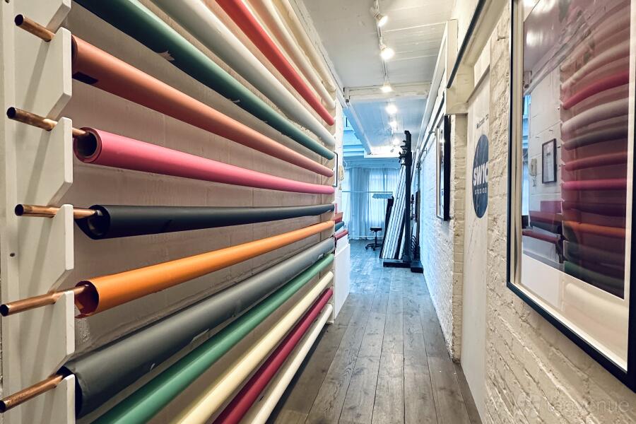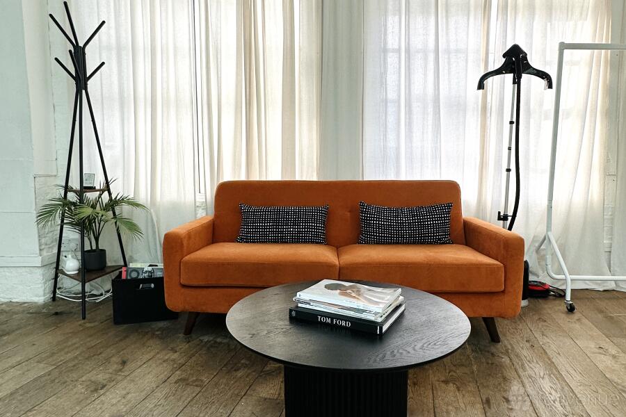 For your comfort, there's a dedicated client area adorned with an inviting orange velvet couch. Stay connected with Wi-Fi access, and take advantage of the well-equipped kitchenette, which includes a Smeg coffee machine, kettle, toaster, microwave, and fridge.