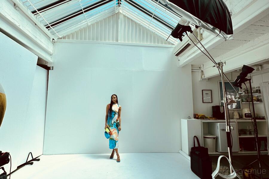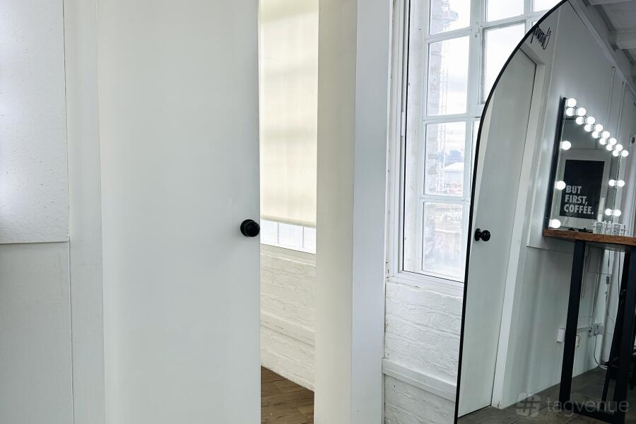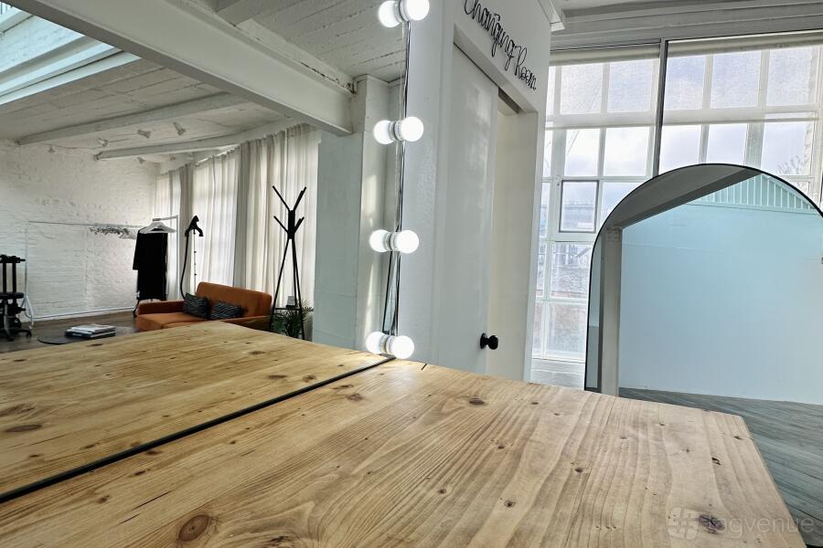 The room boasts a pristine white shooting wall stretching 4 meters and an exposed white brick wall for added character. You'll find a bespoke makeup station complete with a Hollywood light mirror, two barstools, and a private changing area. Additionally, there's a styling table, clothing rails with hangers, and a handy steamer.