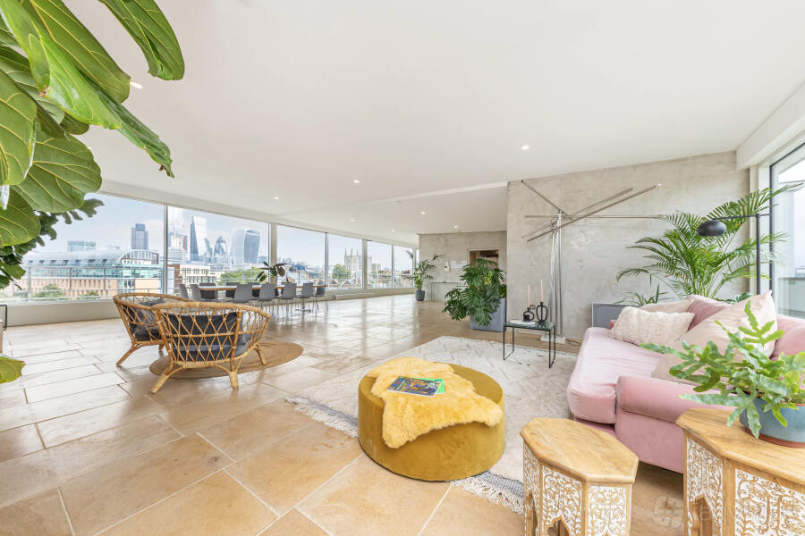 Occupying the top floor of a Southwark Street property, the Penthouse has 263 sqm of floor space and 67 sqm split across two large balconies. Access is by lift into a lobby opening into the penthouse.