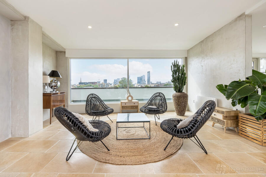 Comprising high-end furniture and industrial features, the penthouse has concrete walls, a solid stone floor, 2 large balconies, a kitchen & bathroom and 45m of floor-to-ceiling windows.