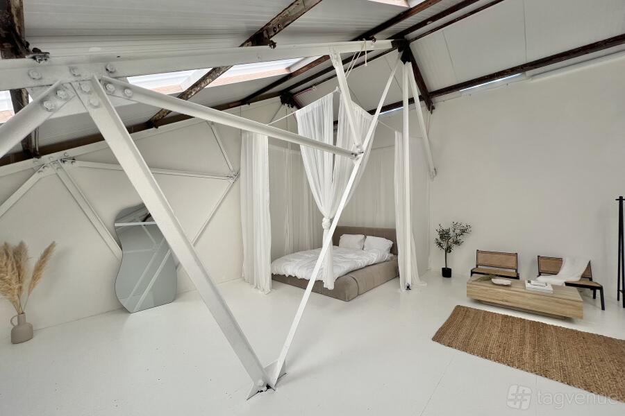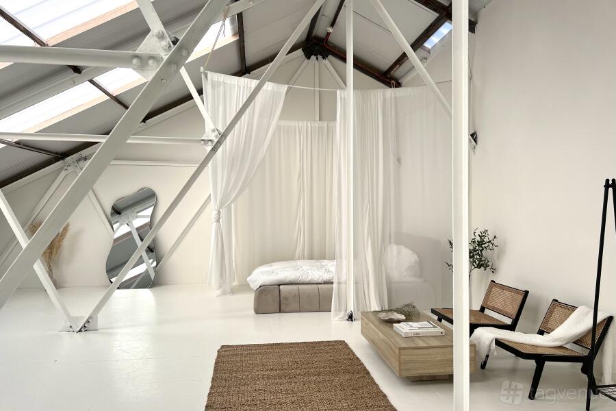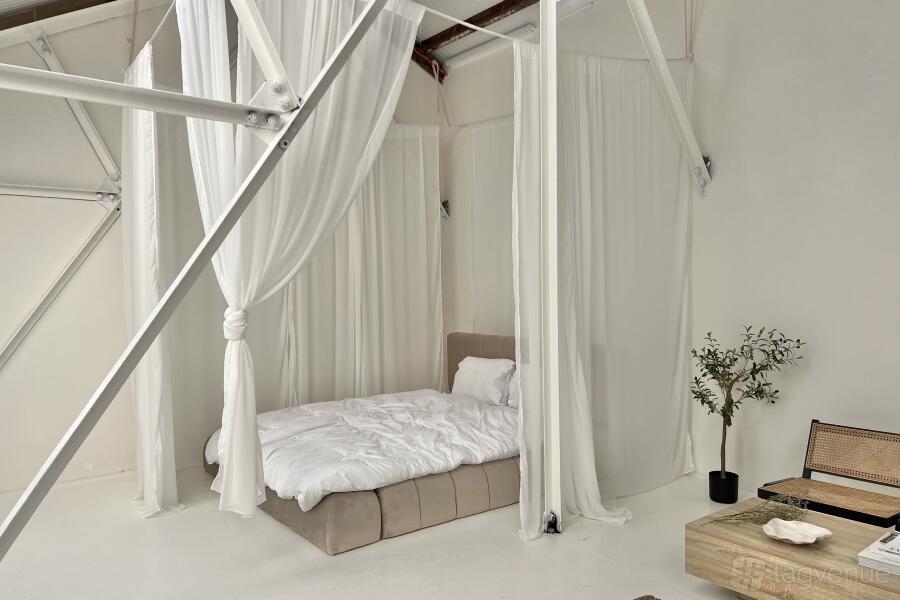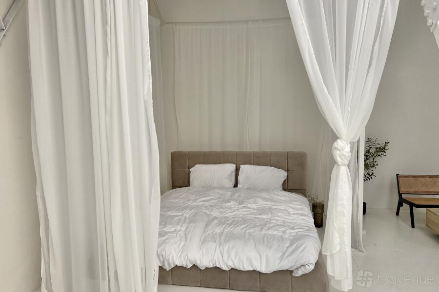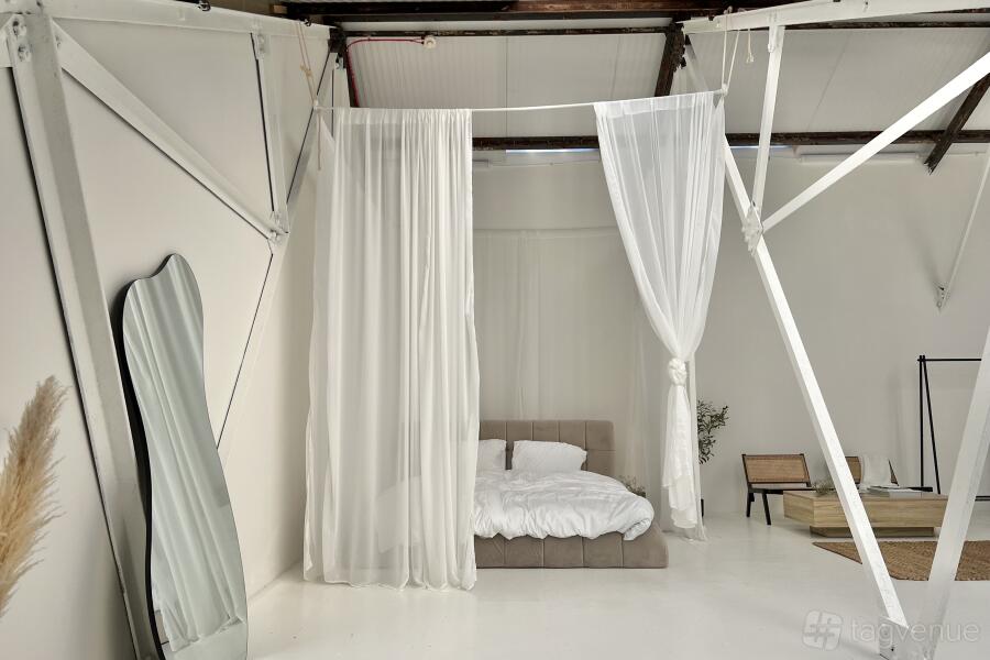 Boasting a generous 1600 sqft spread across two floors, our studio features captivating elements, including a beautifully crafted built-in arch and an infinity cove. Versatility is key, with multiple sets available, including one adorned with a bed and draped curtains.