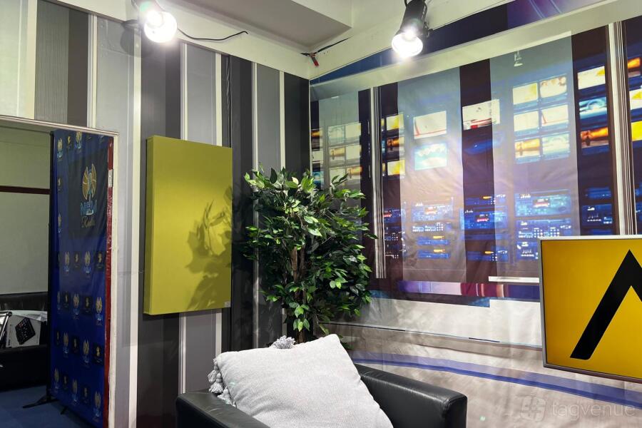 The studio can be rearranged for various needs, including online training, reaction videos, and tutorials. It has a Multicam setup and overhead lighting.