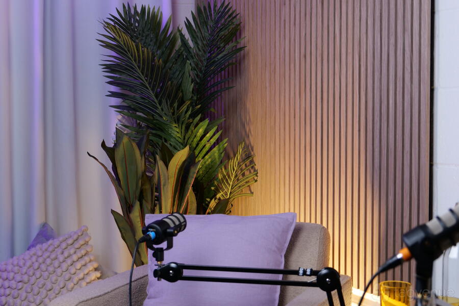 In addition to our photo studio, we've got a state-of-the-art podcast studio meticulously designed with cutting-edge technology, ensuring the optimal environment for producing high-quality recordings. Illuminated with warm, vibrant lighting, our studio enhances the atmosphere and sets the stage for captivating visuals.