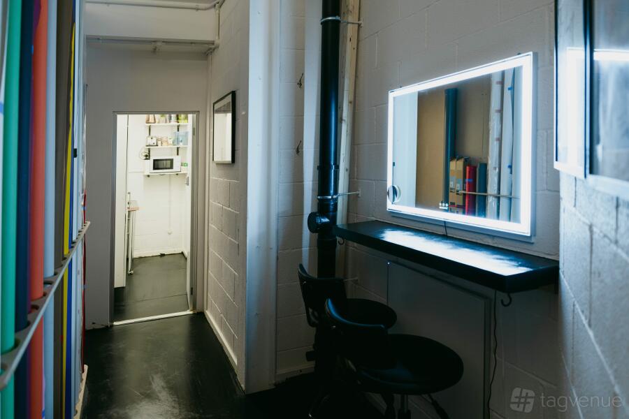 Features include exposed brick and textured walls, a high ceiling, and wooden floors. The studio comes fully-equipped with a kitchenette, styling area, fitting area, bluetooth speaker system and a large TV. Free WiFi, fully serviced toilets and a communal seating area are also provided.