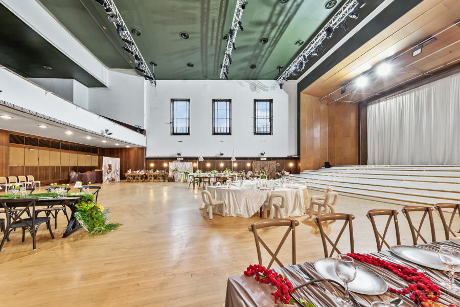 With two halls, including our main space up to 400 in banquet style (up to 1000 in conference style it has theatre seats at the top) and our secondary hall - up to 200 in banquet style, we are truly a multi-functional venue. We have kitchen and bar facilities, plenty of changing rooms and toilets, as well as about 14 meeting rooms.