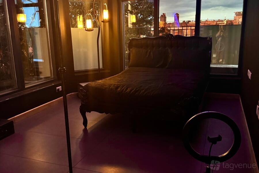 The lower floor includes a fully equipped kitchen with modern appliances, an extra-large living room with a biofuel fireplace, a makeup/changing room with its own en suite bathroom (which can also serve as a shoot space), a second bedroom with a dark rococo theme, and two sets of stairs ideal for unique shots. There is also a wrap-around balcony with additional 360-degree views of London.