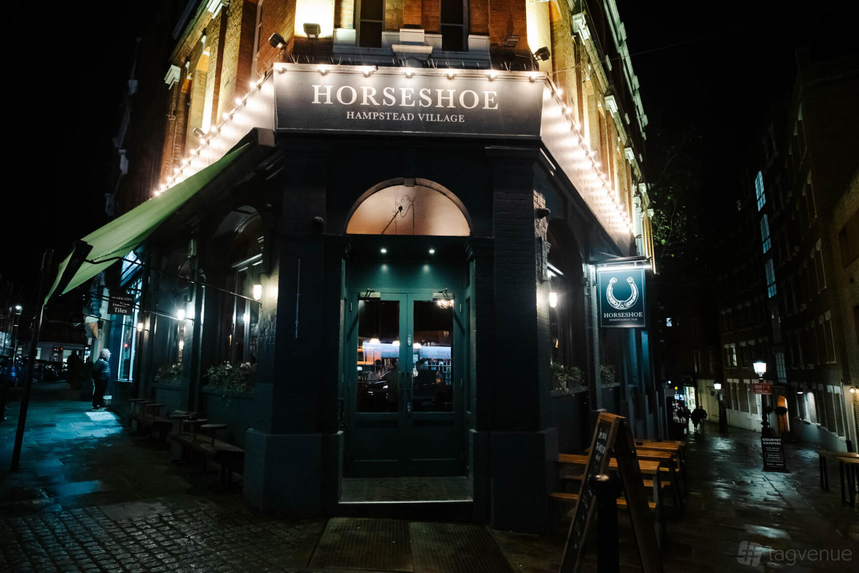 The Horseshoe is located at 28 Heath Street, in the Hampstead, London district of London. The nearest metro station is Hampstead Station.