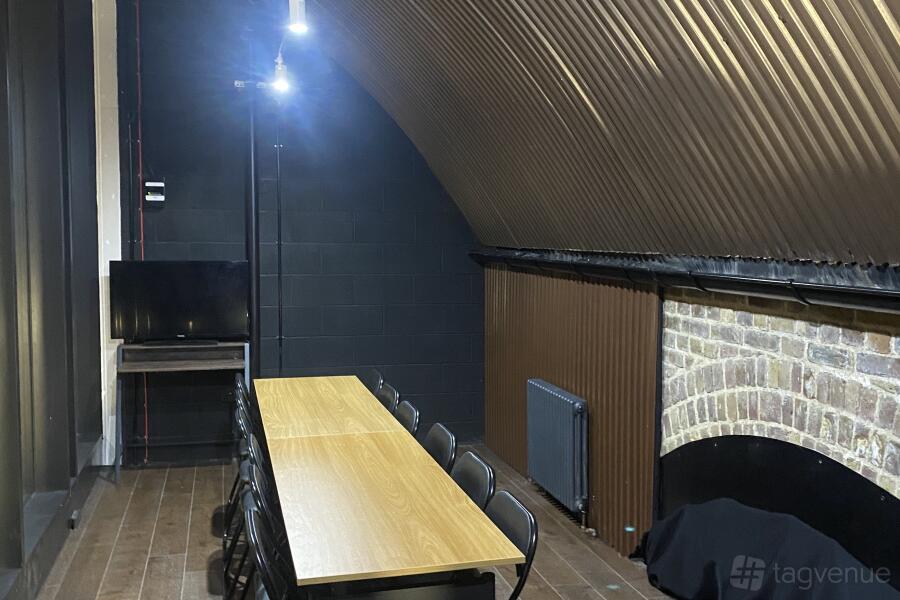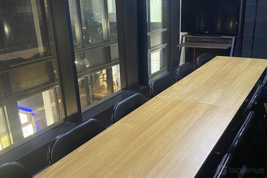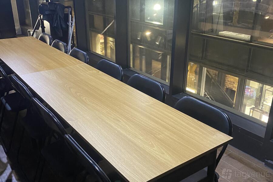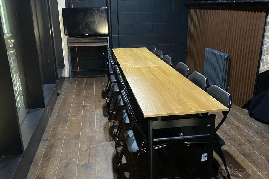 The space is fitted with 2 tables that can fit 14 people, but an extra table can be added to fit another 7, so it can accommodate a total of 21 people. If you don't require tables, they can be put away and you can fit even more people.