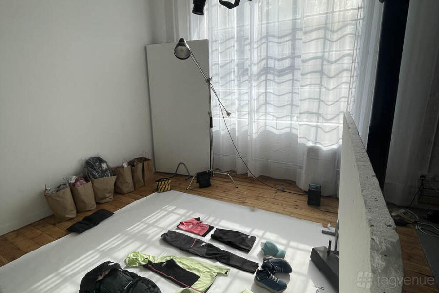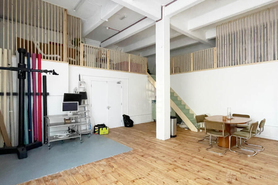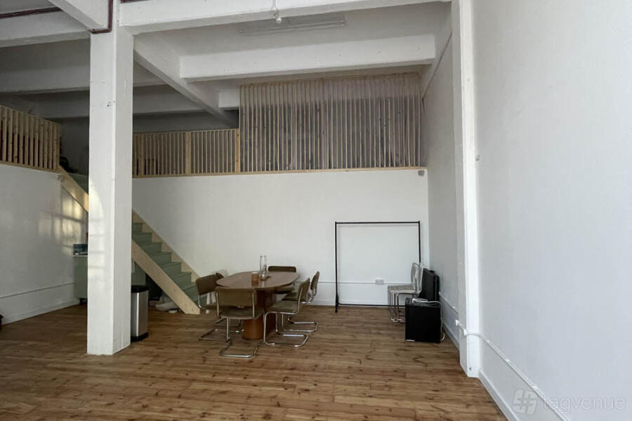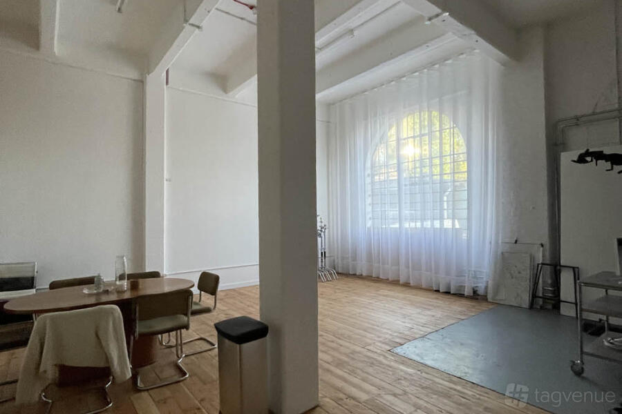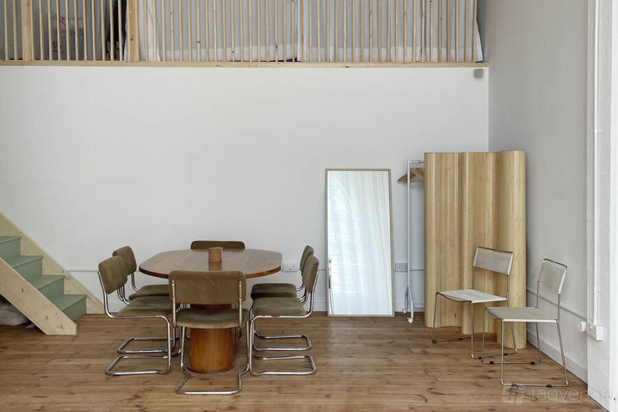 The interior of the space features white walls and a beautiful wooden floor, along with a stunning double-height ceiling, which is perfect for photography. The furniture has been carefully selected by our founder to create a contemporary, light, and inviting atmosphere.