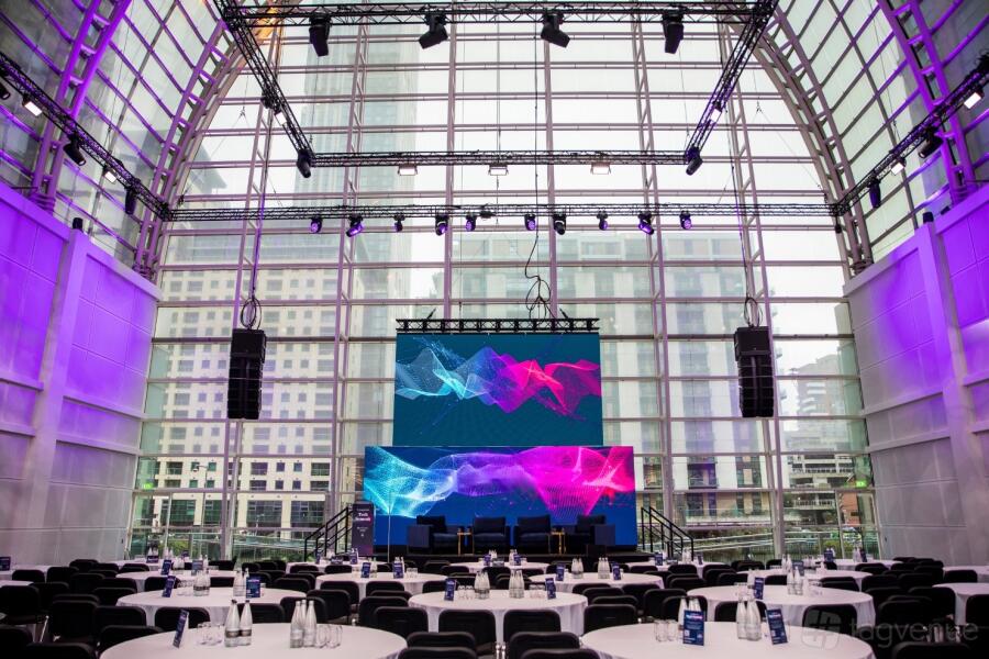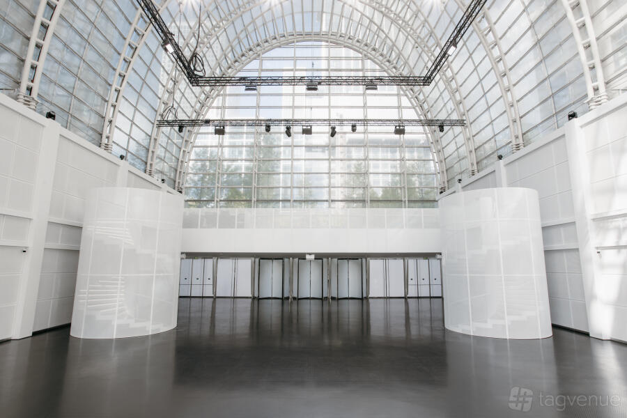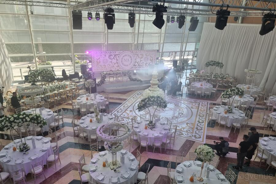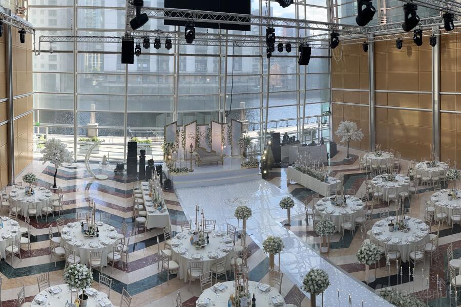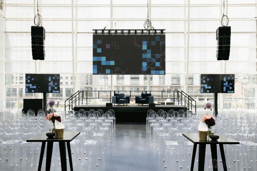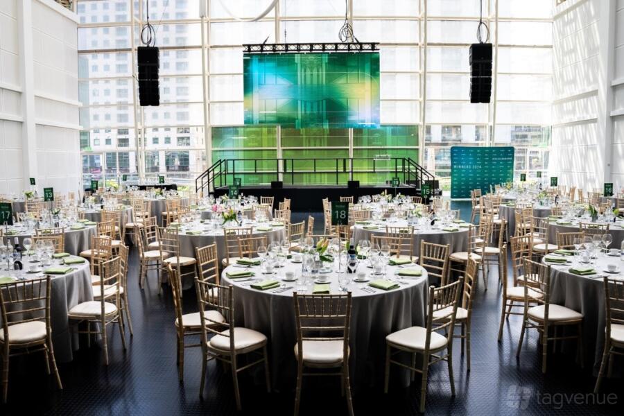 The venue adapts to various events, with custom lighting at night and natural light during the day.