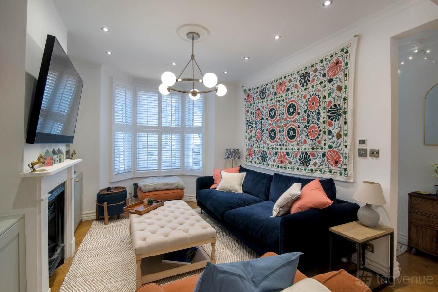 The property features 3 bedrooms including one which doubles as a study, as well as 2 further reception rooms with velvet sofas and mounted TV. The property has two bathrooms, with a shower and bath included, as well as utility area with washing machine and dryer, as well as extra sink and storage.