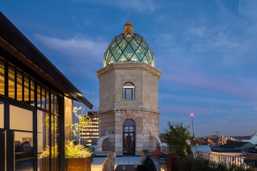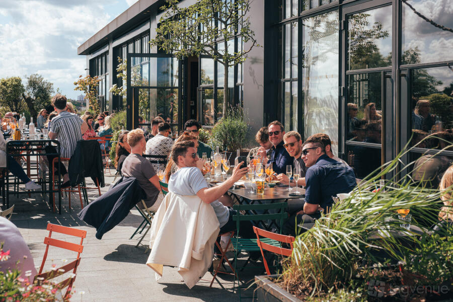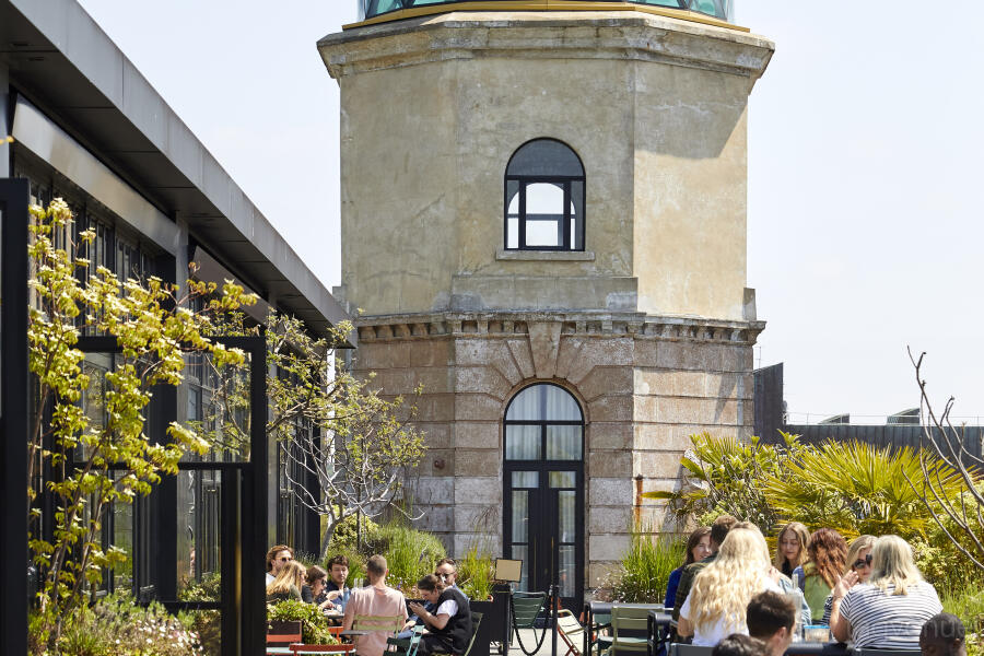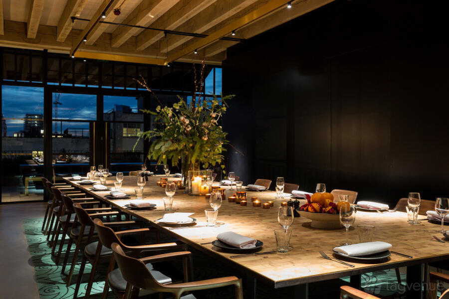 Upstairs, a sprawling 5,000 sq ft rooftop space, brings together a bar, lounge, dining areas, and a beautifully landscaped terrace with views of London.