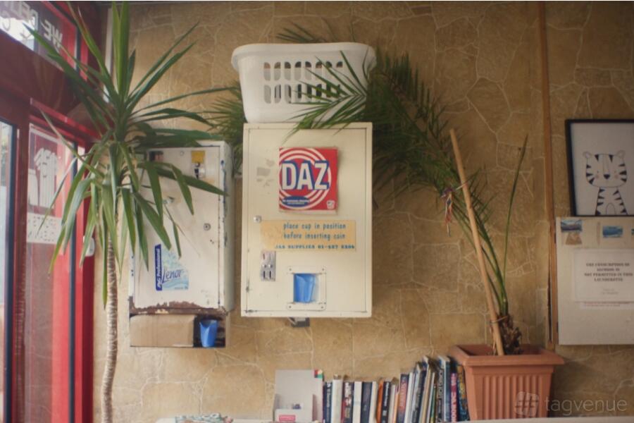 The centrepiece of the launderette is the row of sleek, washing machines and dryers.