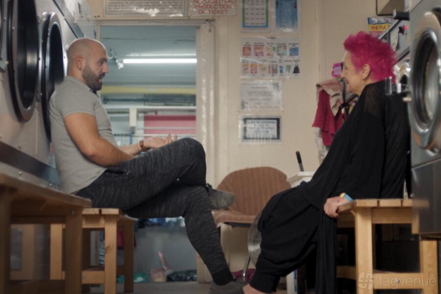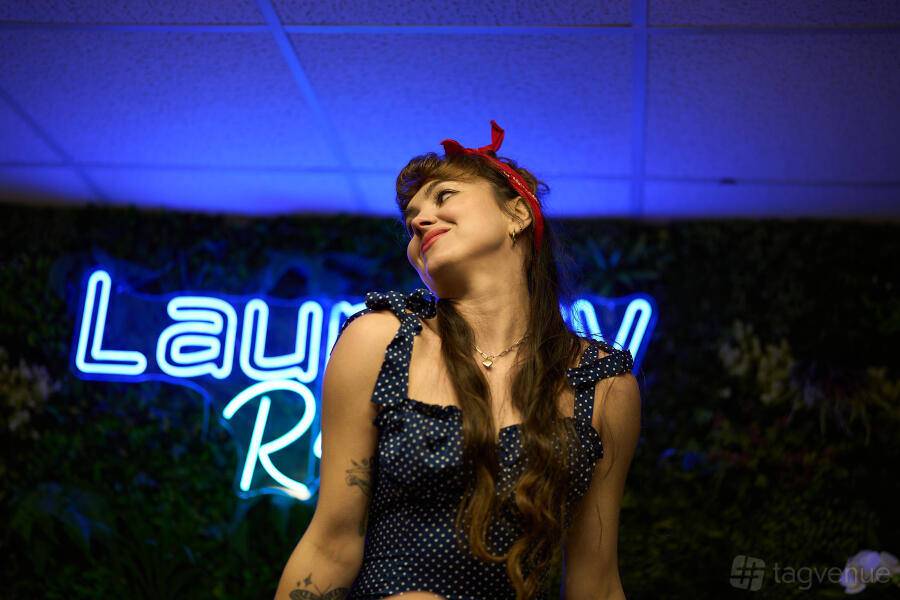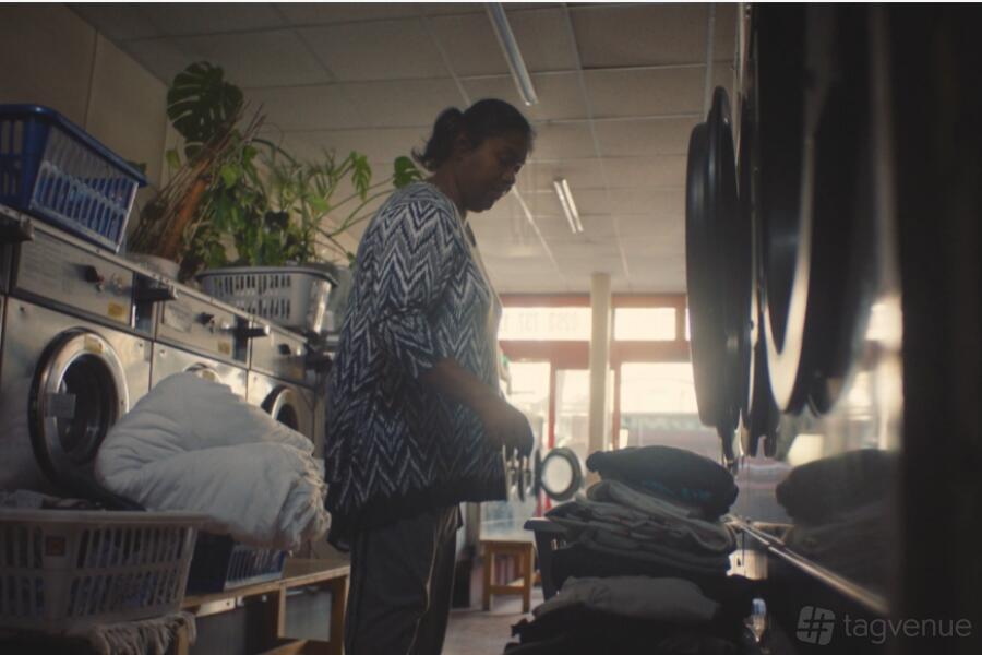 Large windows allow a play of shadows and highlights that can deepen the richness of every image. The launderette’s industrial shelving is stocked with towels and detergent bottles, and creates a visually intriguing backdrop - a mix of everyday function and cinematic appeal.