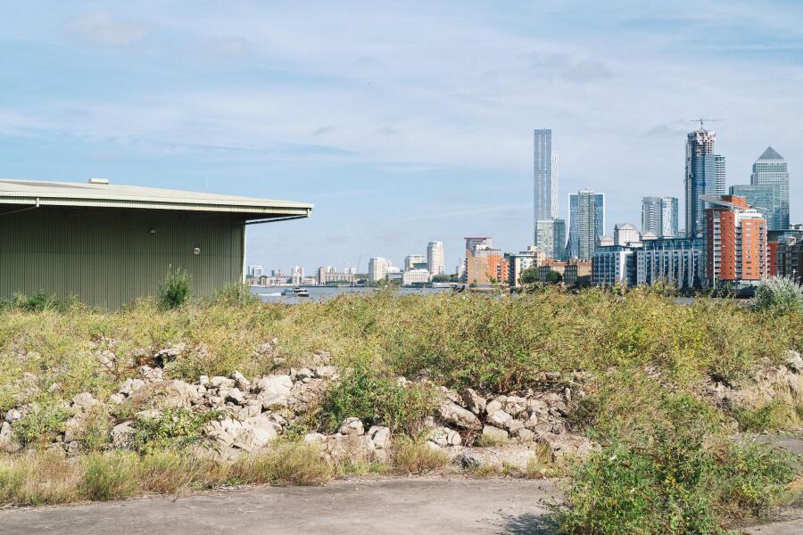 Outside, 12,000 sqm of raw landscape surrounds the warehouse, combining greenery, hard standing, and wild foliage with views of Canary Wharf. This outdoor area can be hired separately for unit bases, location shoots, or large-format activations.