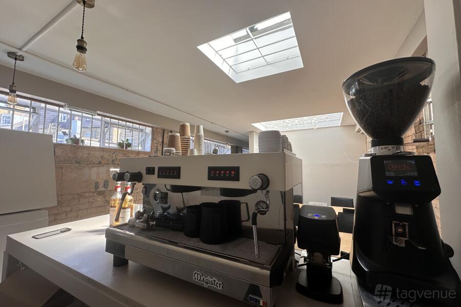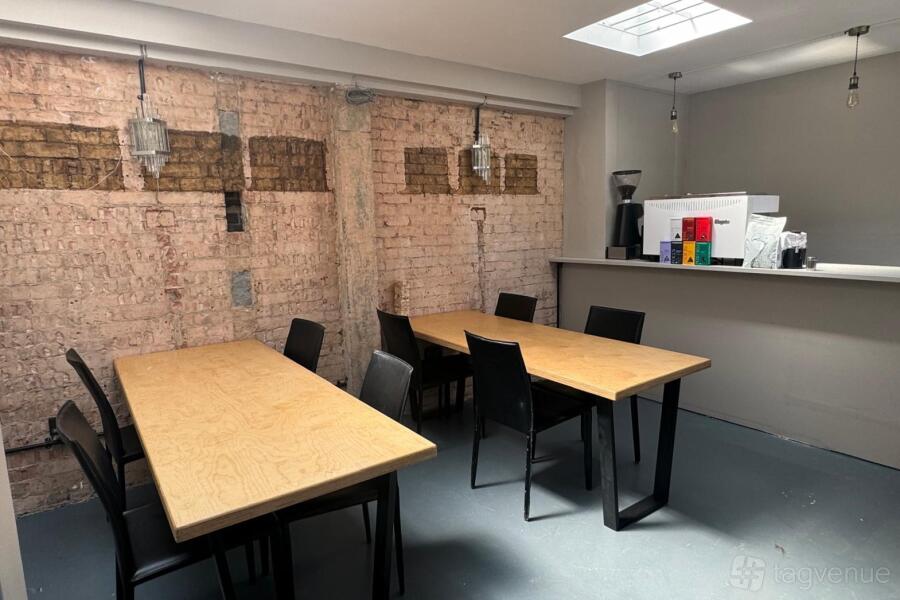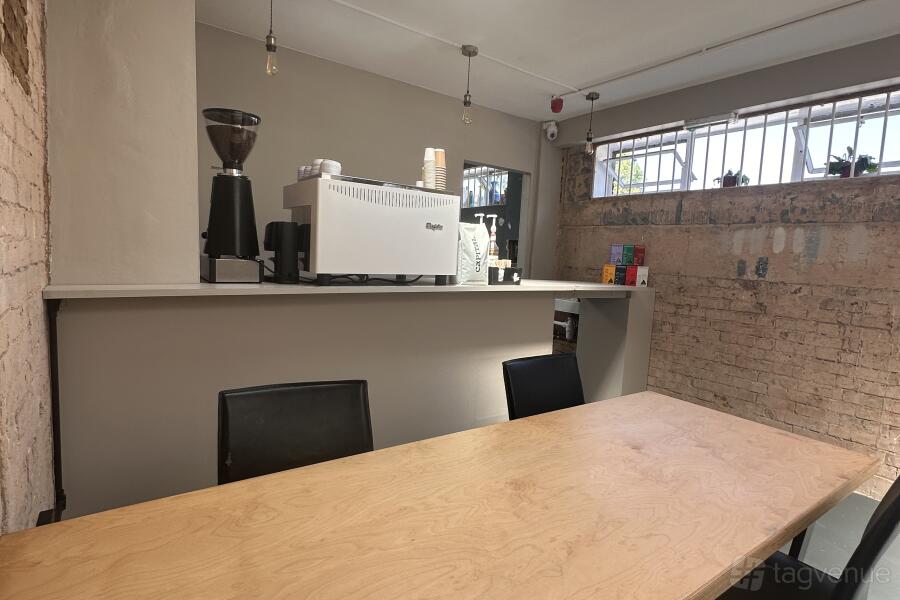 At the back we have the coffee bar with tables and chairs and the space can hold 20 people..