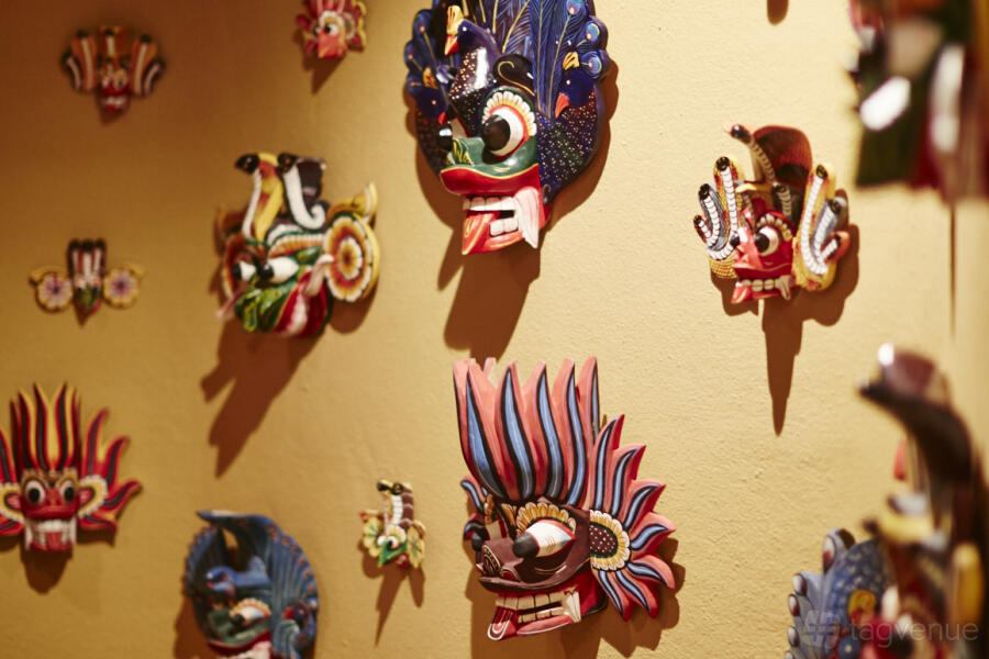 The interior of Hoppers features warm terracotta tiles, a woven rattan ceiling and ochre brick wall finishes. Raksha masks, Sri Lankan poster art and Tamil comic imagery adorn the walls along with pineapple and money plants.