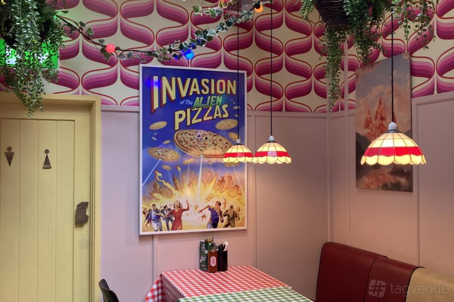 Downstairs is our main dining area, with retro wallpaper and a cozy feel. Head upstairs and you'll see our secret events space. The Dramatic is perfect for private dinners, parties, or dressing up and getting a bit silly. We’ve got ice-cold beers, cocktails, and plenty of spots to settle in with your favorite slice.