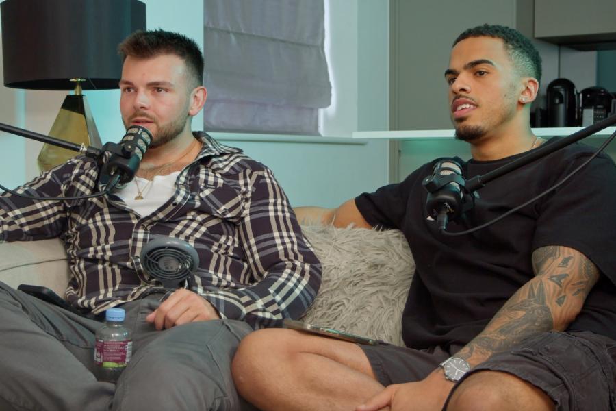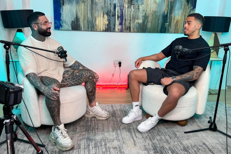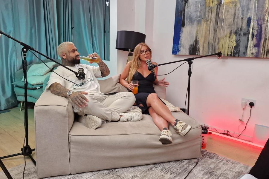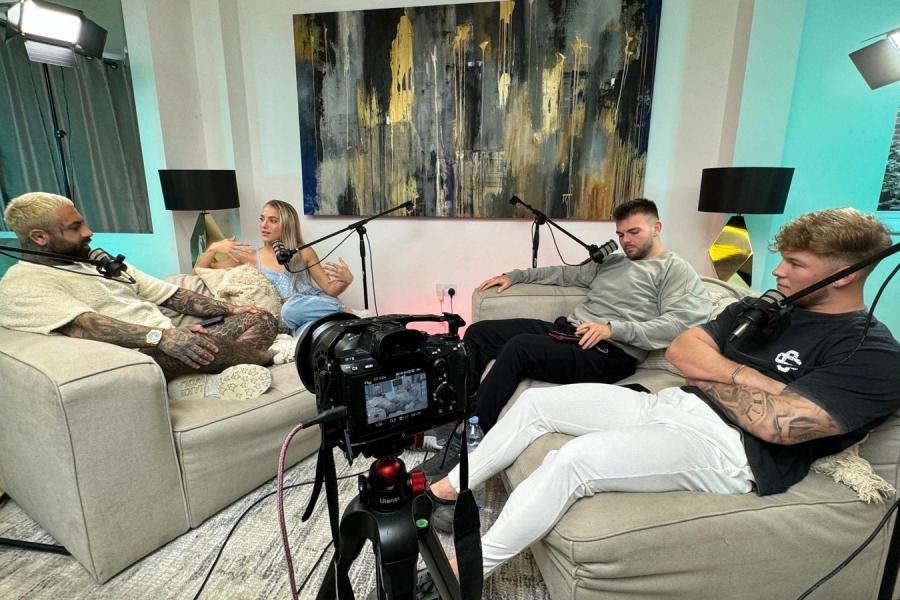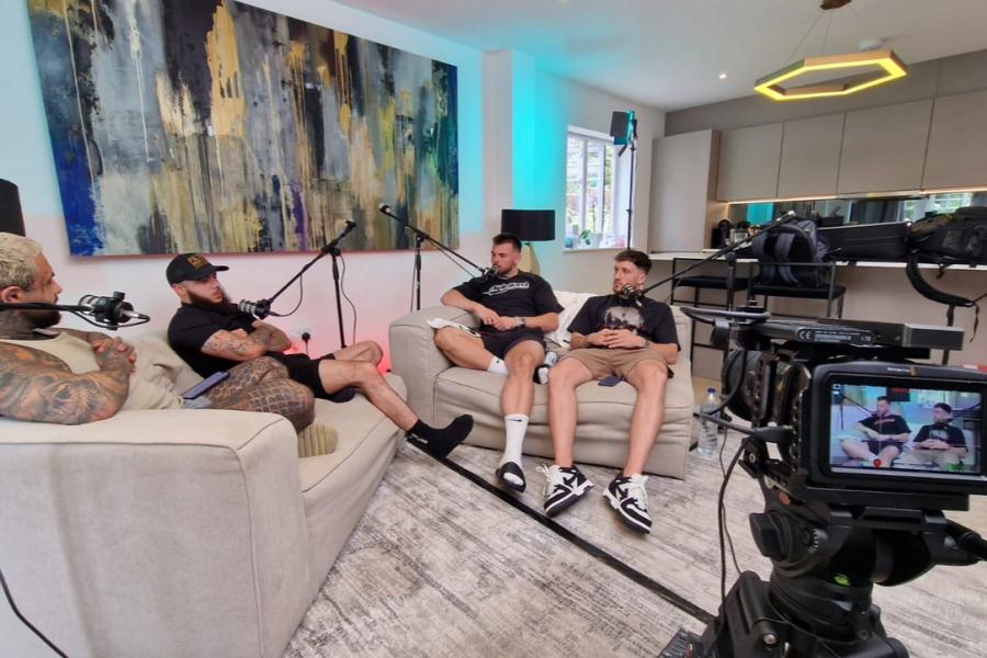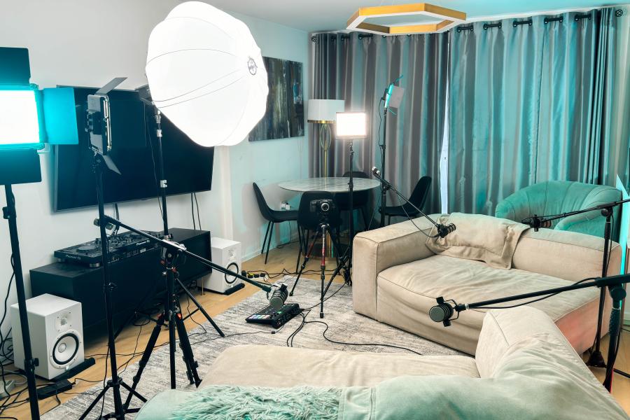 The studio offers comfortable seating tailored for both hosts and guests, and features optional video podcasting capabilities with integrated cameras.