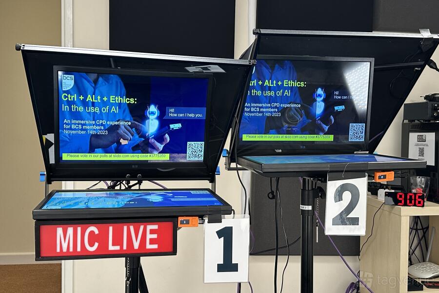 We have all the equipment in-house from cameras, lighting, in-ear talkback, teleprompters, and experienced staff.