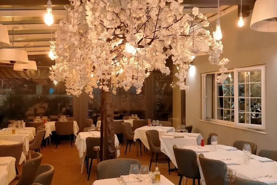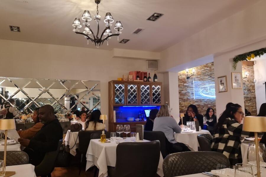 Black leather chairs invite you to sink into comfort, complemented by a pristine wooden floor that adds a touch of classic refinement to the space. The restaurant's white color palette enhances the air of purity and simplicity, creating a serene atmosphere that transports you to the heart of Italy.